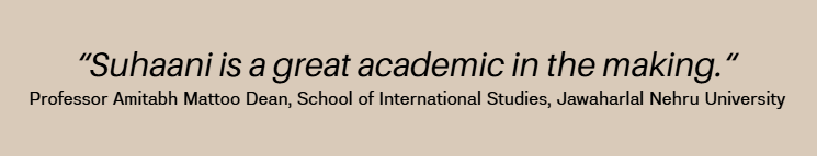 Namaste, I’m Suhaani Rajyalakshmi Singh, a 17-year-old student of the Shri Ram School, India. I am passionate about political reform, women-led development, Indian classical dance and my pet beagle, Mischief. I’m from a small town in rural India, Padrauna in Uttar Pradesh, I study in the capital city region and my aspirations are global. I thrive on challenges and my go-to inspiration is this line from the Bhagawad Gita, ‘Nishkam Karma’ -perform the action without thinking of the personal gain from these actions’.